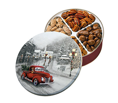 Feast on four flavorful pecan favorites presented in a decorative Four-Sectional Tin (#725) filled with 1/3 lb. Glazed Pecans, 1/3 lb. Sugar and Spice Pecans, 1/3 lb. Roasted Salted Pecans and 1/3 lb. Chocolate Covered Pecans.